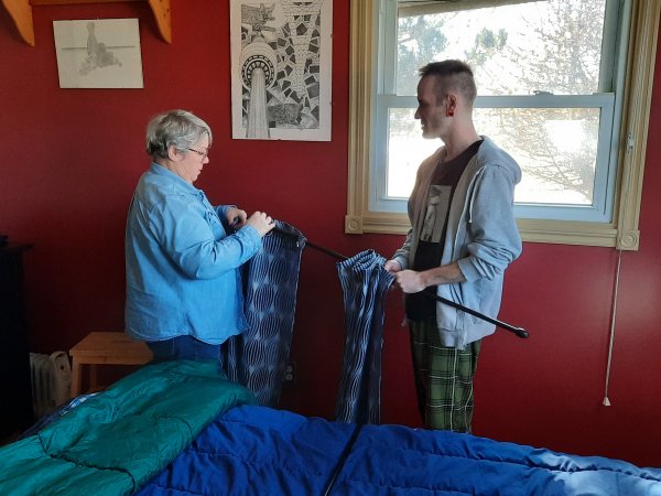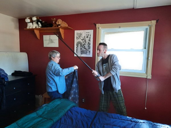 Patricia and Andrew move stuff around to make room for Jannie and Jan's