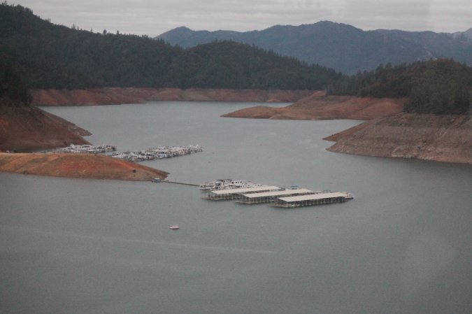 Shasta Lake (reservoir). It is almost 150 feet below the normal water level.