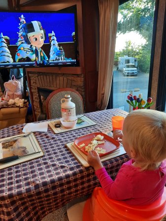 Breakfast with crepe, brown sugar, maple syrup and watching cartoons on