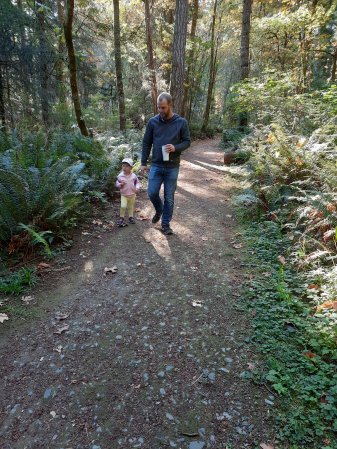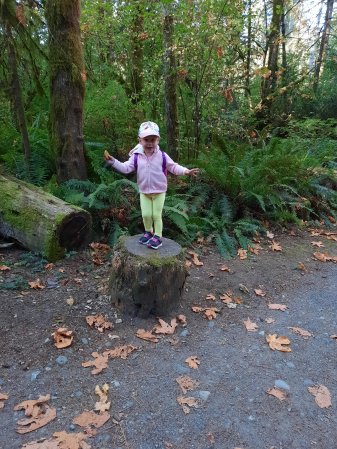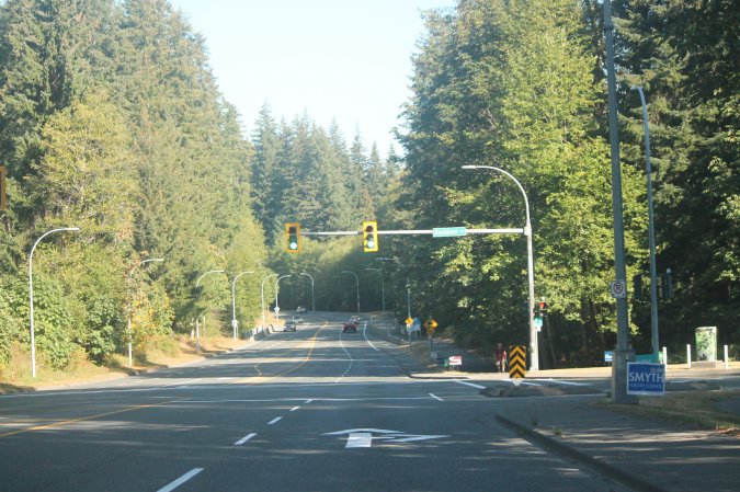 The roads on Vancouver Island are so beautiful. Look at the tall trees.