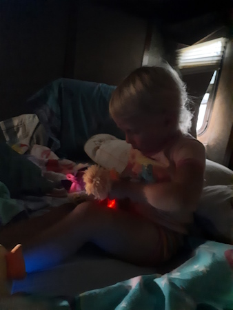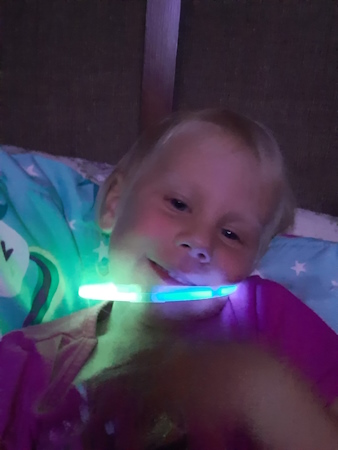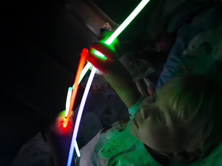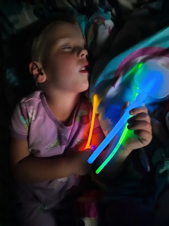 Natasha is spoiled. She gets glow sticks again tonight. She is hanging on to them.
