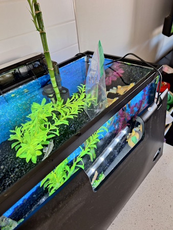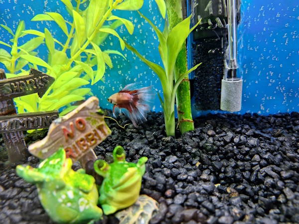 This is the new Beta fish who moved into the aquarium a few days ago. His name is Major Payne, like in the movie.