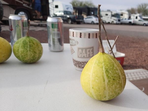 Jan picked up some desert melons in the desert. They are for Jannie. They are not good for humans consumption.