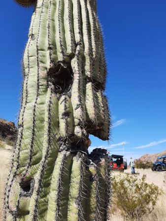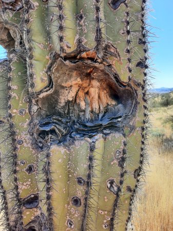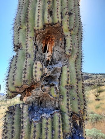 I found this saguaro beautiful in his ugliness. Birds have done this to the saguaro.