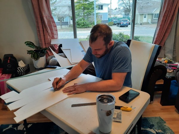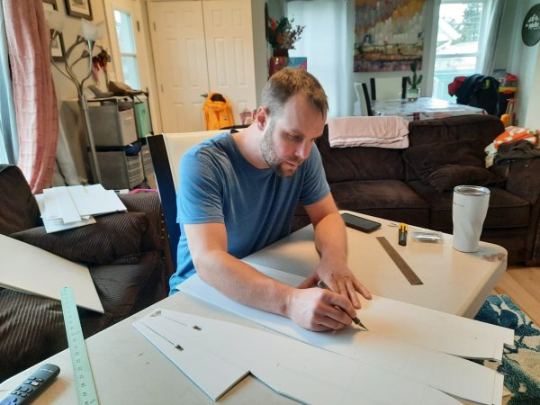 Jeremy is cutting Styrofoam to make an RC airplane.