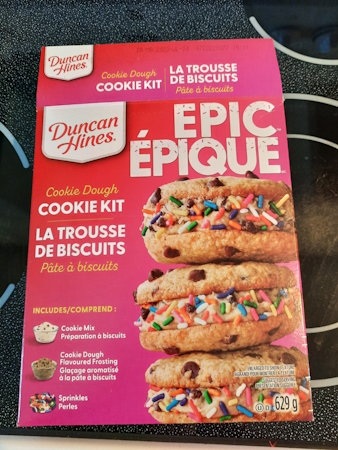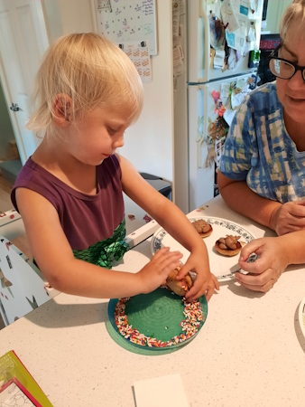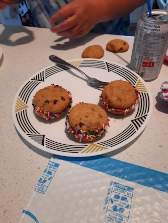 With the icing between two cookies. She rolls the cookies in the sparkles.