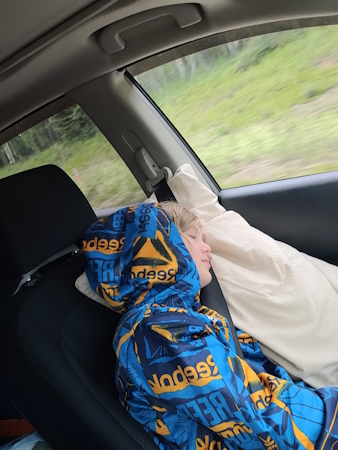 Jeremy and Gabriel left Blackfalds, Alberta, this morning. It seems Gabriel needs more sleep.