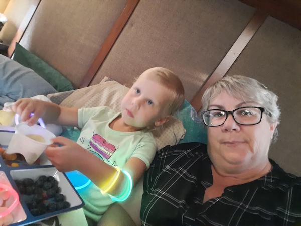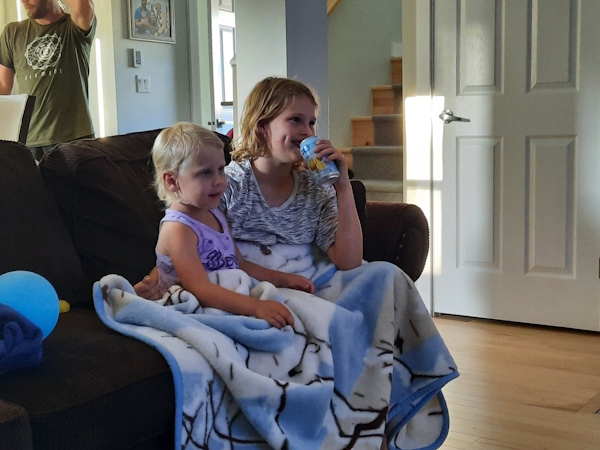 Natasha and grand-maman are in the bedroom having junk food and snacks, watching a movie.