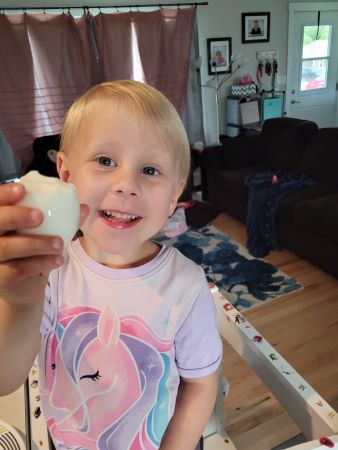 It is the first time Natasha removes the shell from her hardboiled egg.