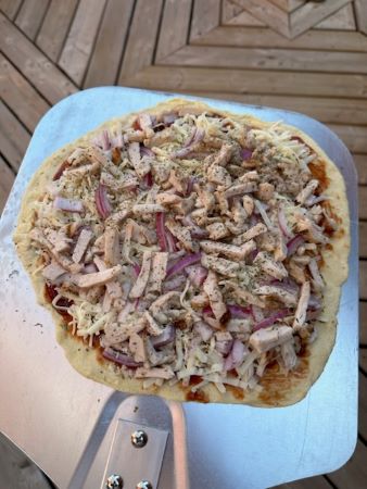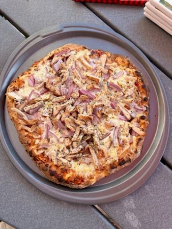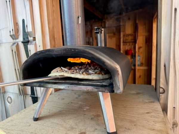 The pizza oven is above 700° F. The pizza cooks in about 15 to 20 seconds.