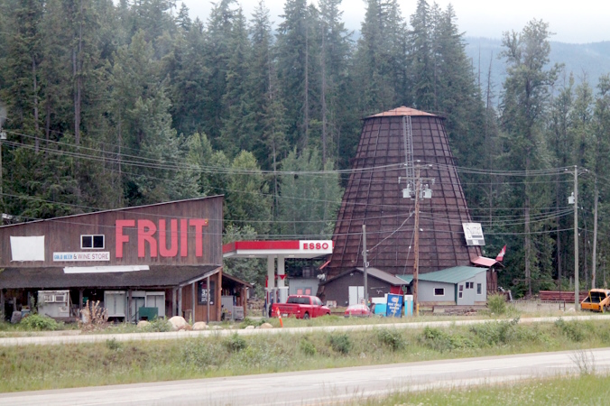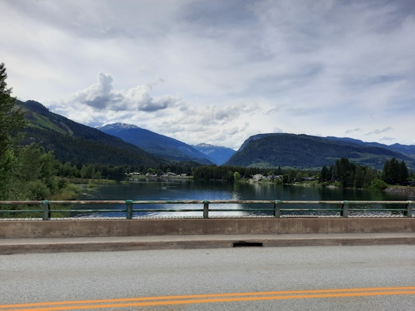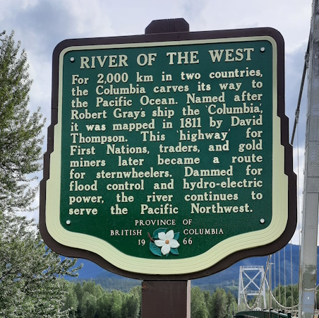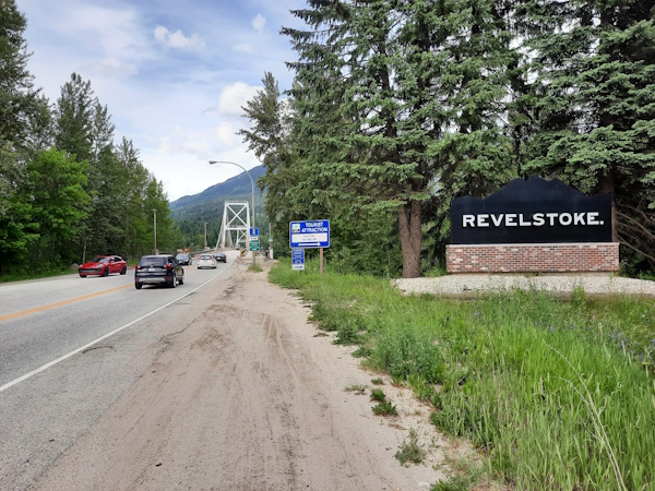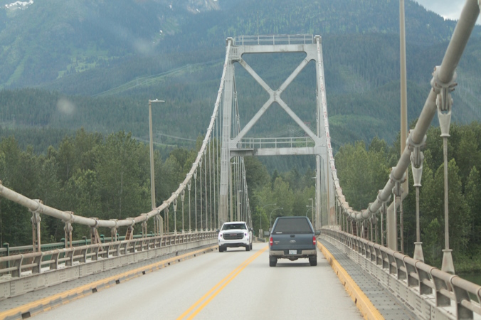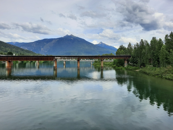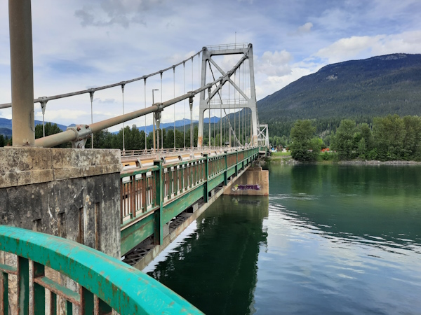 The bridge crosses the Columbia River in Revelstoke, looking west.