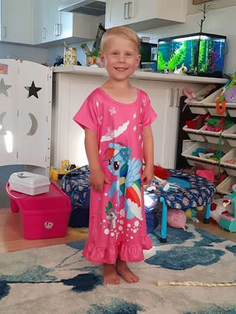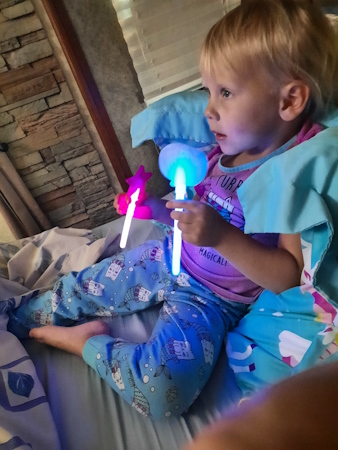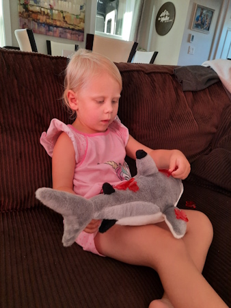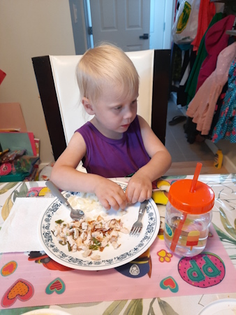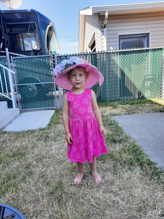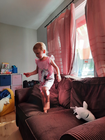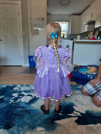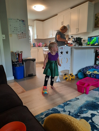 Natasha is getting ready to go to daycare. She even wears her mom's shoes.