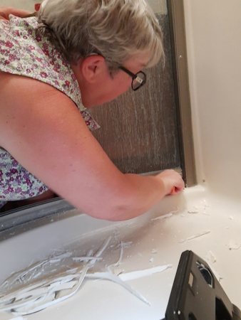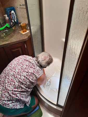 Michele cleans both shower doors before we put them back on. I sealed the bottom of the shower.