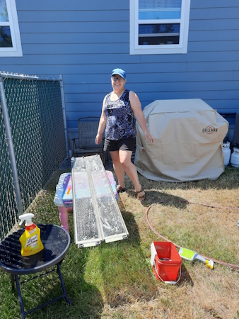 I removed both sliding doors and Michele removed all the old sealant. Michele did a great job.