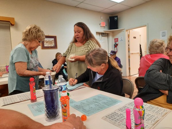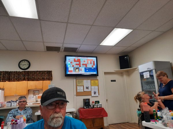The TV behind Dennis gives us all the information needed for the bingo games.