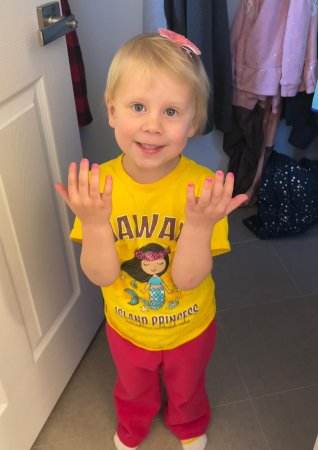 Natasha has a pink day, pink nail polish and a pink hair clip.