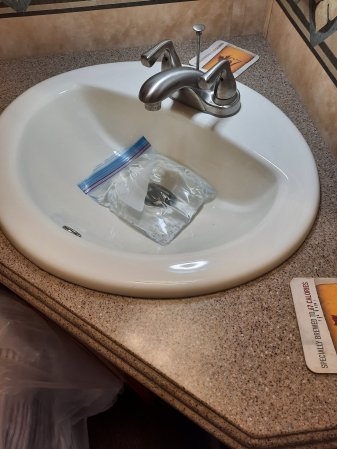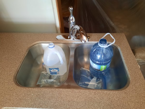 The same thing in the bathroom sink and the kitchen sink. Notice we also added a 1 gallon water jug.