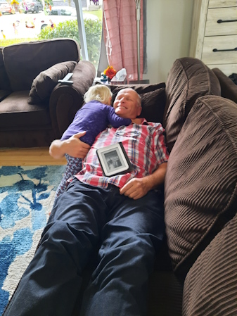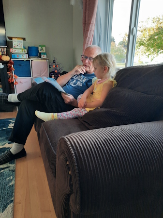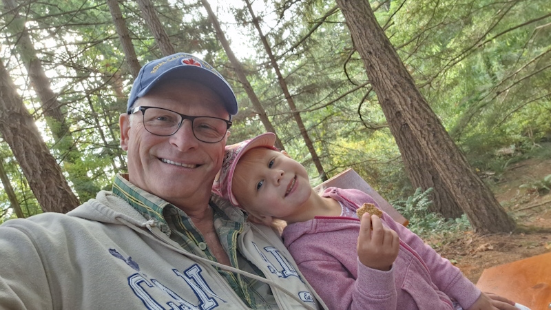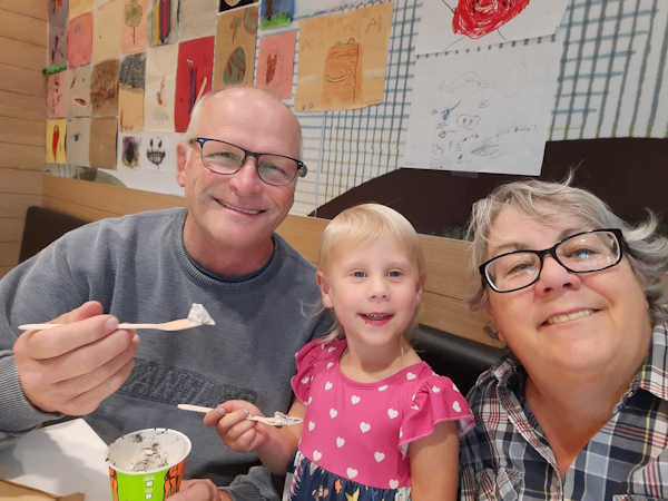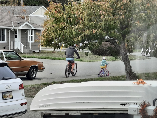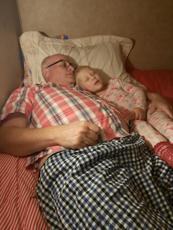 She had a nap with grand-maman in the trailer. After that, she went biking with her dad.