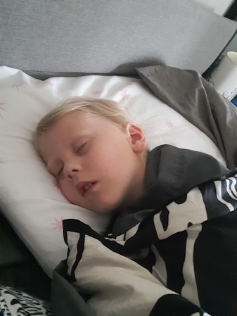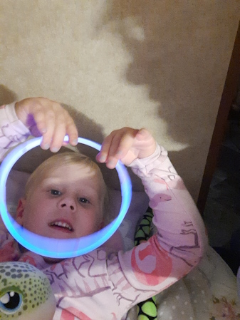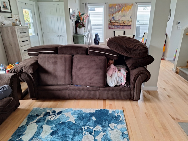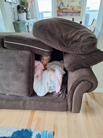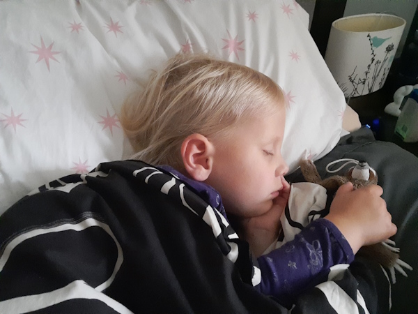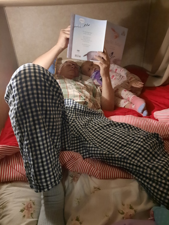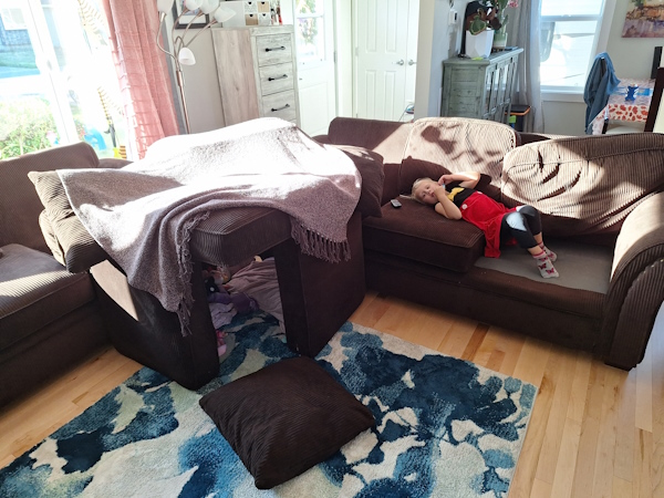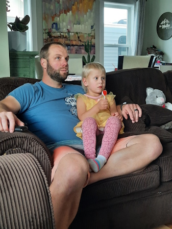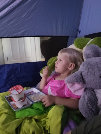 It is a special night for Natasha. She is sleeping with Daddy in the living room in the beach shelter.