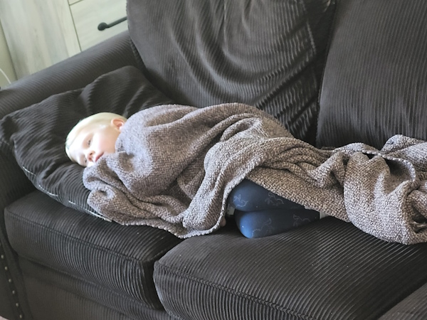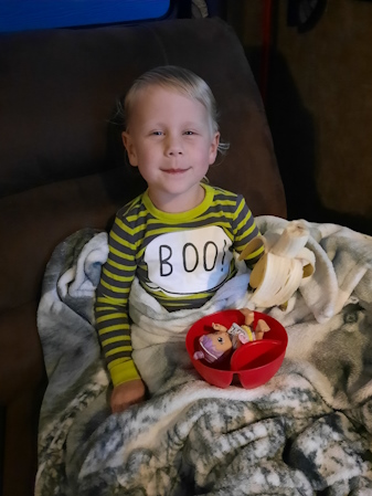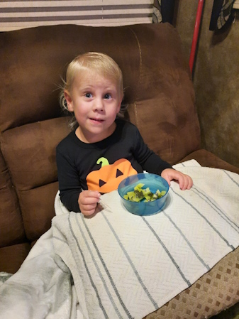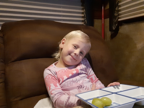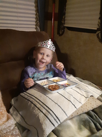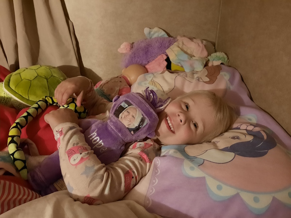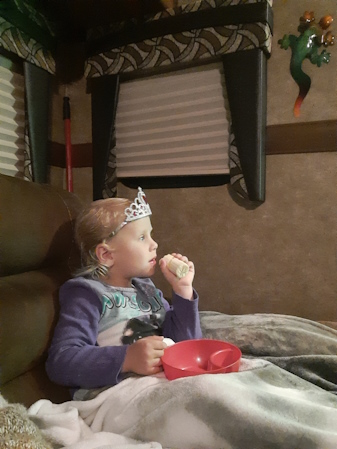 Since Jeremy is working late today, Natasha is sleeping in the trailer with us.