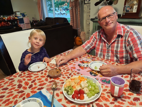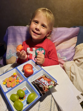 Since we are Saturday, it is the real "Sleepover" night. That means watching TV in bed with grand-maman, and snacks in bed.
