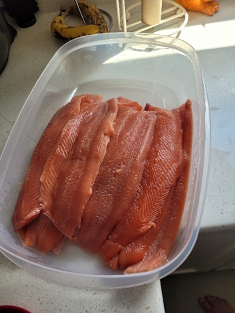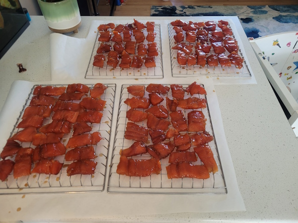 The pink salmon soaked all night, and once they were wiped and rested on the counter, they went to the smoker.