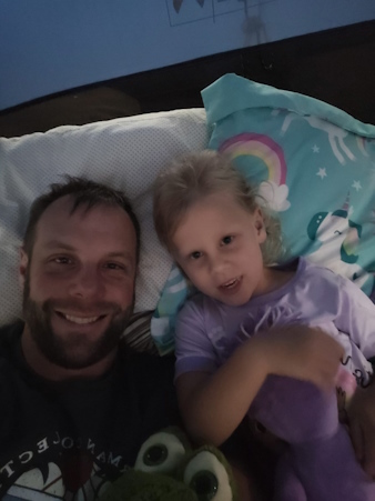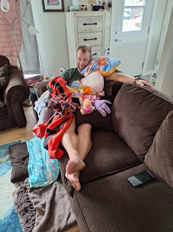 When Natasha got back from daycare, she tried to bury her dad under toys.