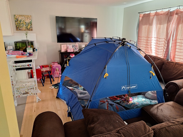 Jeremy is off for the next two days. He and Natasha are having a campout night in the living room.