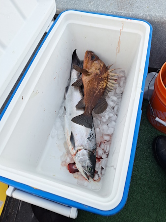 One hour later, I caught a coho salmon and Jeremy a rock fish.