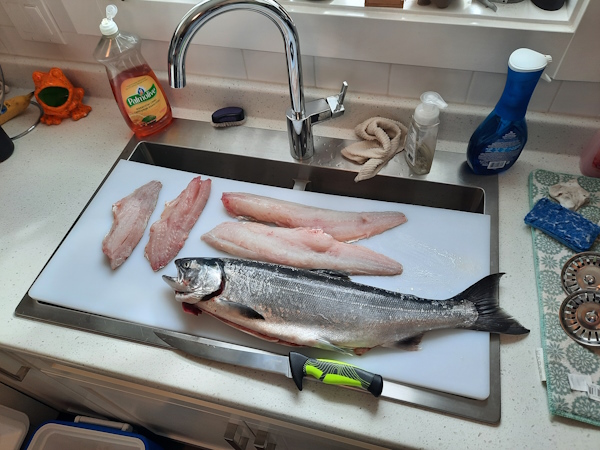 The small fillets are from the rock fish and the bigger ones are from the lingcod. The salmon will be filleted and frozen.