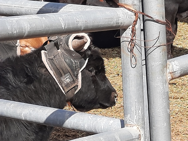 This young calf has a protective harness around his neck to protect him from the rope during an event.