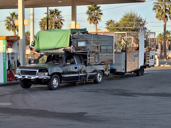 When we got out of the Burger King, we saw this truck and camper... No windshield either.