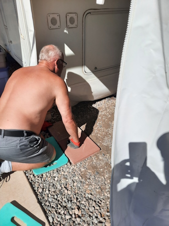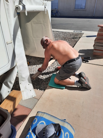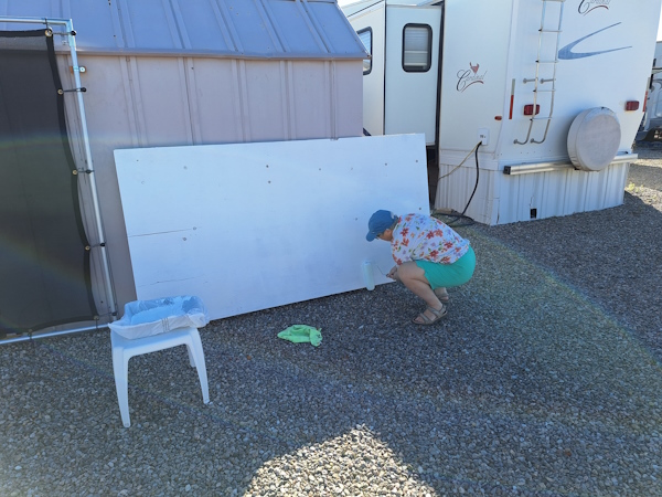 Michele had the idea to paint the plywood before we installed it in the shed. The paint came with the 5th wheel.