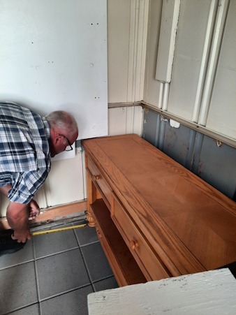 A little miscalculation on my part. I had to cut a small corner of the plywood so the dresser would fit back in its place.