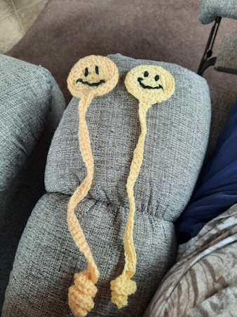 Michele is trying to crochet some bookmarks. The first ones are out of yarn, and the one on the right is smaller yarn.