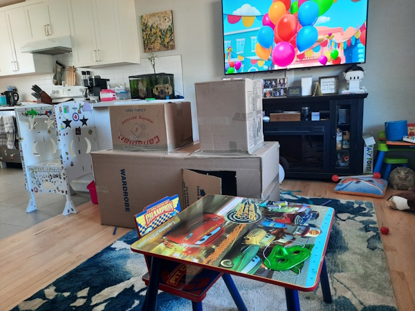 Yesterday, Jeremy made a castle out of cardboard boxes for Natasha.