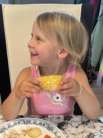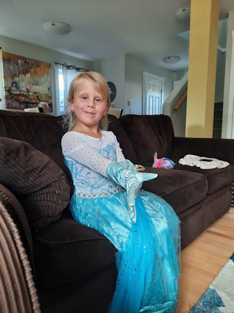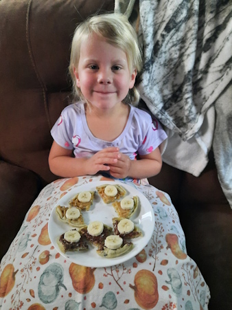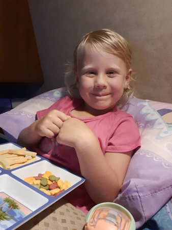 She is watching a movie in our bedroom with grand-maman. Treats are required too.