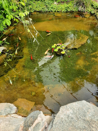 They have a pond with some turtles. The water is not very clear and we cannot see anything.