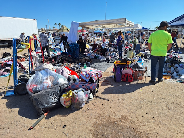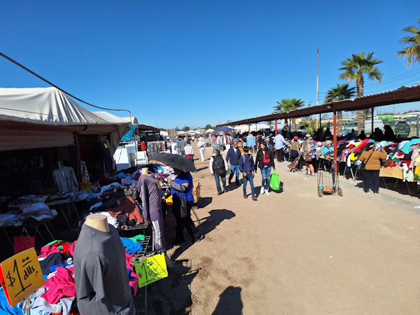 We have more vendors today, like this one with clothes on the ground and people rummaging through it.