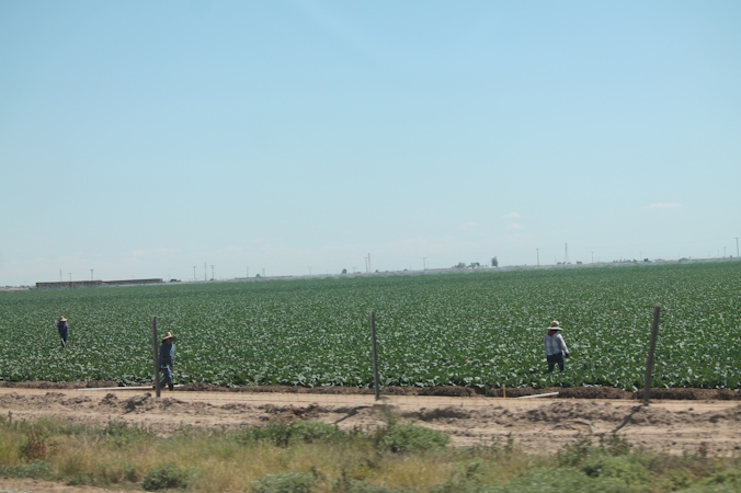 The outside temperature is 80° F. Yet the field workers are still dressed as winter.
