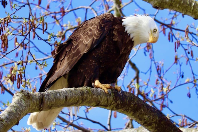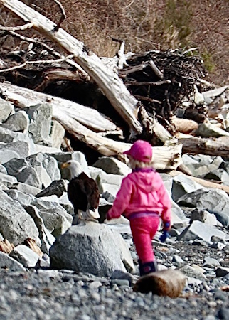 Natasha is on her way to the big rocks. She does not even notice the eagle landing near her.