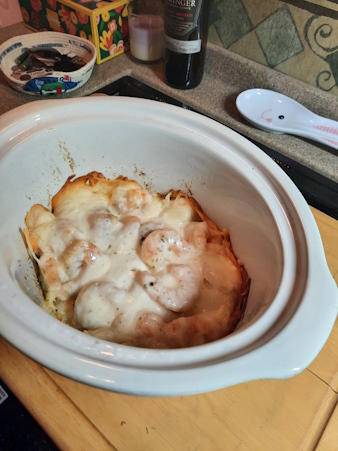 You lay down sliced lemon on the bottom. You place large frozen shrimp